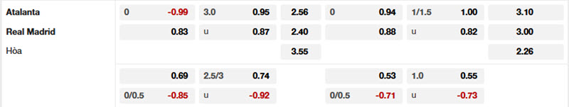 Bảng tỷ lệ kèo Atalanta vs Real Madrid