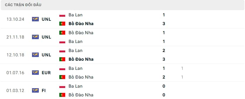 Thành tích đối đầu Bồ Đào Nha vs Ba Lan