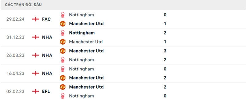 Thành tích đối đầu Man Utd vs Nottingham