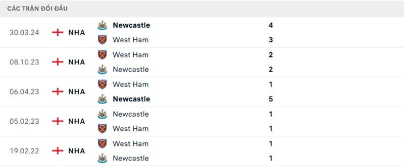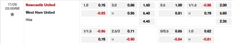 Bảng tỷ lệ kèo Newcastle vs West Ham