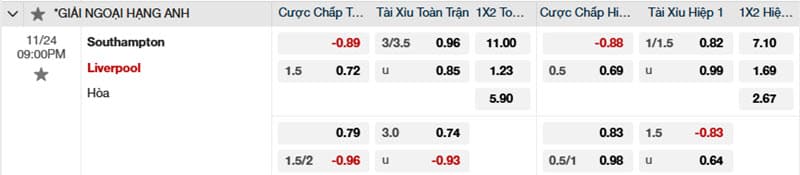 Tỷ lệ kèo Southampton vs Liverpool