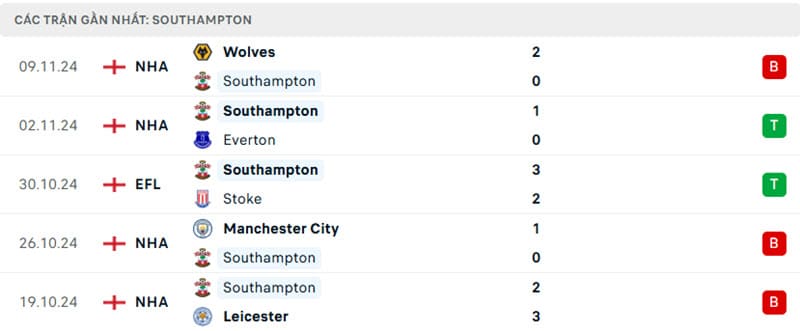 Southampton đang trải qua giai đoạn khó khăn khi đứng cuối bảng với vỏn vẹn 4 điểm sau 11 vòng đấu. Thất bại 0-2 trước Wolves ở vòng đấu trước đã đẩy họ xuống vị trí áp chót, tạo thêm áp lực lên vai HLV Russell Martin. Dù vậy, The Saints vẫn còn một số điểm sáng khi giành được toàn bộ 4 điểm trên sân nhà St Mary’s với thành tích 1 thắng, 1 hòa và 3 thua. Họ cũng vừa có 2 chiến thắng liên tiếp trên sân nhà trước Stoke City (Cúp Liên đoàn) và Everton (Premier League) trước khi thua Wolves.