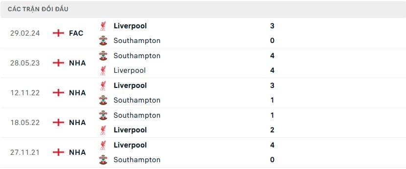 Thành tích đối đầu Southampton vs Liverpool