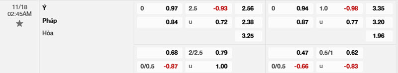 Bảng tỷ lệ kèo Ý vs Pháp
